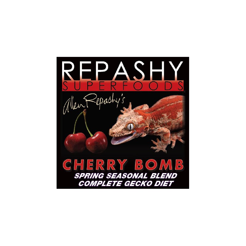 Repashy's Cherry Bomb is a limited Edition, Seasonal Blend Gecko Diet for Fruit Eating Omnivorous Species. Featuring Dried Sweet Black Cherry Powder.