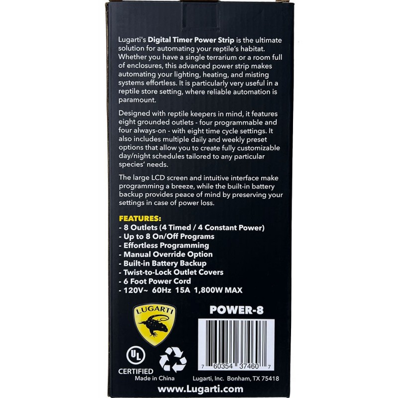 Lugarti's Digital Timer Power Strip is the ultimate solution for automating your reptile’s habitat. Whether you have a single terrarium or a room full of enclosures, this advanced power strip makes automating your lighting, heating, and misting systems effortless. It is particularly very useful in a reptile store setting, where reliable automation is paramount.